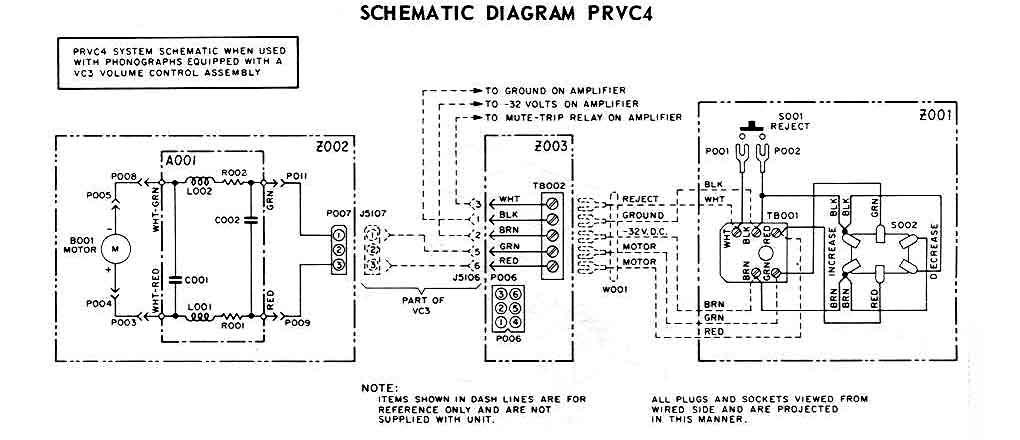 the left is a scanned schematic of a PRVC3, showing the color-coded wires