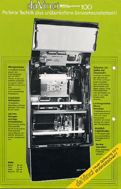 So ends the saga of the search for the SMC1 Jr. If anyone has any further information, please ask Mike to forward it to me. Postscript:Since this article was published, some new information has come to light. First, I have a photo of a PCC3 with the 'normal' transformer (i.e., the one that the chassis was originally designed for, which partially protrudes through the chassis. This transformer may be the same as was used in PCC1 and PCC2. Since the PCC3 does not have provisions to support a dollar bill validator, the current rating of the 29 VAC winding can be reduced, resulting in a smaller transformer for the later production. After having a chance to examine photos of other PCC3s, (another from Europe, and one from here in the U.S.) and some close-ups of the one above, I have come to think that my original conclusion about the two transformers was wrong. First, the two transformers are identical, down to part number and date code. The left-hand transformer has only its WHT-BLU and WHT-BLK secondary winding wires connected (the rest are cut short and wrapped with tape), while all of its primary winding wires are connected. This leads me to believe that the original power transformer (the one on the right) had a problem with this secondary, and that the one on the left was installed to fix the problem. The repairman must have been too lazy to remove the faulty transformer, since he would have had to disconnect all of the wires. Thanks to Dave Repp, who recently purchased (as of September, 2004) a domestic 100-79M, who sent me photos of it and answered innumerable questions from me. This is the first time I have heard of a U.S. version of the machine. Also thanks to Chris Guerts of Belgium for photos of his DaVinci and for sending me a photo copy of his DaVinci manual. The comment above about Stern using the PCC1 instead of the PCC2 in their version of the SMC2 is incorrect. Stern actually used the same PCC2 as Seeburg used in the few SMC2s built before the bankruptcy took place, but whereas the Seeburg version included a small (1 inch by 1 inch) PC board and a chassis-mounted triac (an AC power switching semiconductor) to control the power to the small spotlights shining on the disco ball, Stern eliminated the board and triac, keeping the lamps on any time the machine was under power. Typically, this would have necessitated a change in model number, but Stern did not operate that way. Also, it appears that either very early (or very late, I'm not sure which) PCC3s used a larger transformer, probably the same as was used for the PCC2 or PCC4. The PCC4, by the way is identical to the Stern version of the PCC2 except that the additional connectors for the dollar coin have been eliminated. I believe the same power transformer was used in both, since the Light Organ used in the SMC3 (which uses the PCC4 as standard equipment) runs from the same voltage as the spot lamps used on the SMC2 to illuminate the disco ball. Thanks to Ron Rich for prompting this update. Following are a pair of photos I downloaded from a recent eBay auction, selling a German language DaVinci brochure. This is the first brochure I have ever seen for this machine.