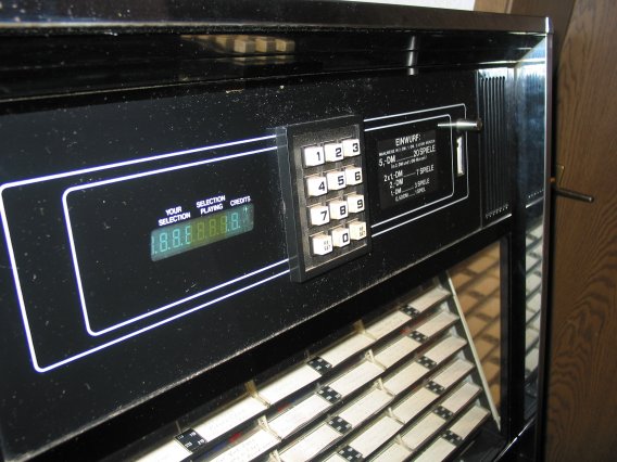 In the 100-78D, the selector panel mounts a DES100 selector, identical to those used in the black and gray boxes, except for the selection-encoding PC board inside. Also located on this panel are the credit and 1st digit lamps, and a circular lamp display unit, which houses several of the same lamps as were used in the STD2 Entertainer and later machines. The display used a mirrored glass to give the same sort of 'infinity lamps' display as was used in the Entertainer, although there was no lamp animation in this model. It was, after all, the 'bargain basement' jukebox model of the Seeburg line. This and the graphics panel patterns are the only difference between the 100-78D Celestia and the earlier 100-77D Topaz.
